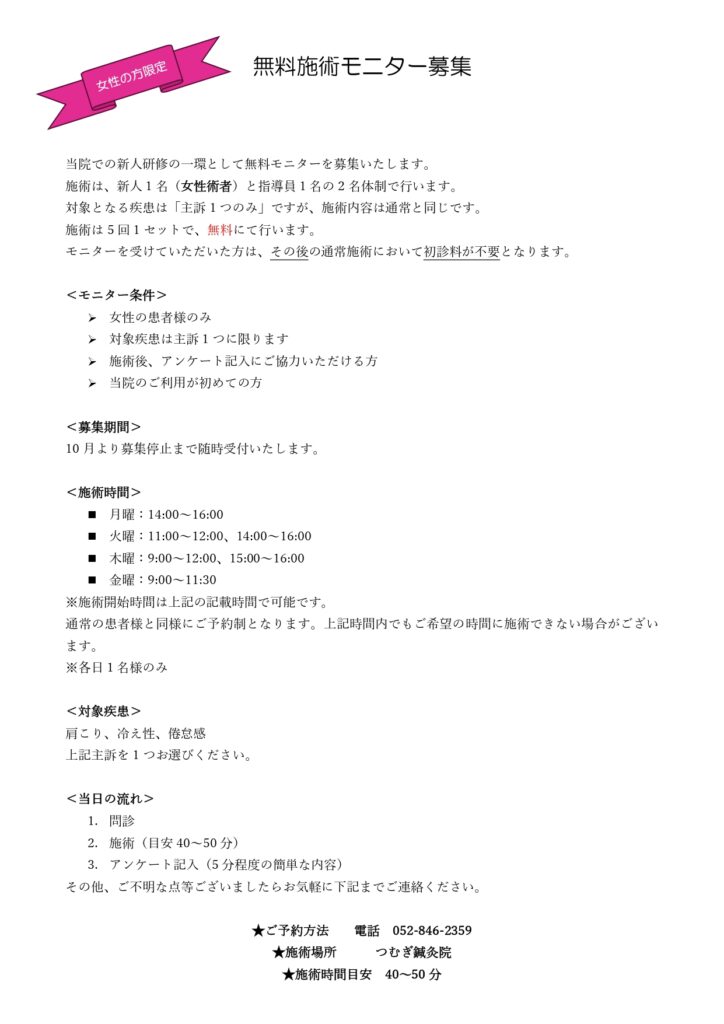 当院での新人研修の一環として施術を受けて下さる無料モニターを募集いたします。